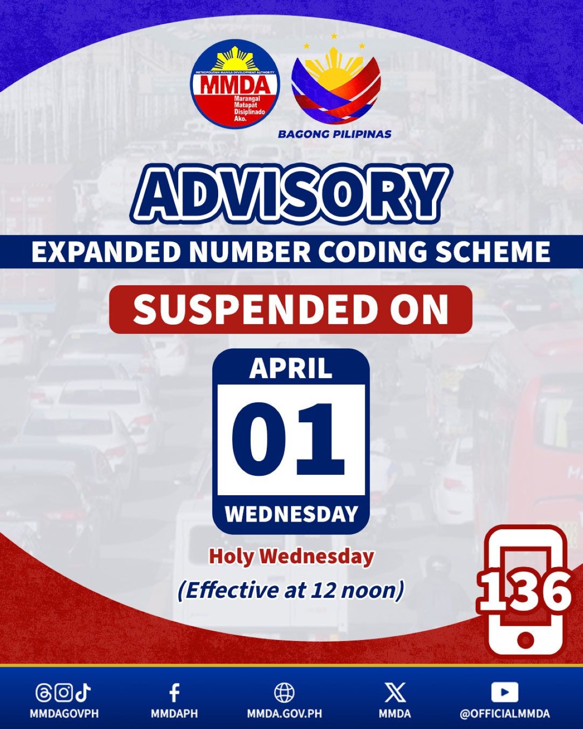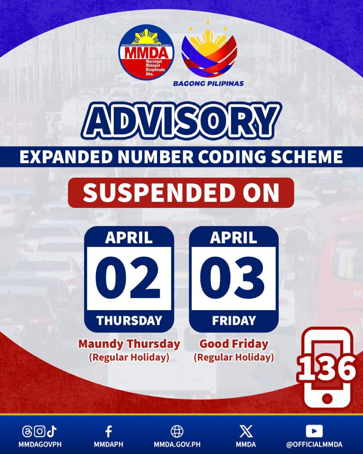 Base sa ulat ng MMDA, suspendido sa buong araw ng Huwebes Santo at Biyernes Santo ang coding scheme, samantalang epektibo naman simula 12:00 ng tanghali ang coding para sa Miyerkules Santo.