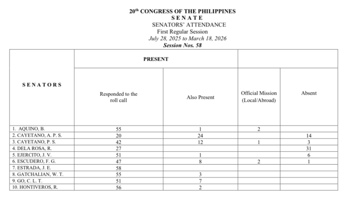 Ayon sa tala ng nasabing senador, 27 na beses lamang na nakatugon si Dela Rosa sa kabuuang 58 na mga araw na isinagawang sesyon ng Senado mula noong Hulyo 28, 2025, hanggang Marso 8, 2026.