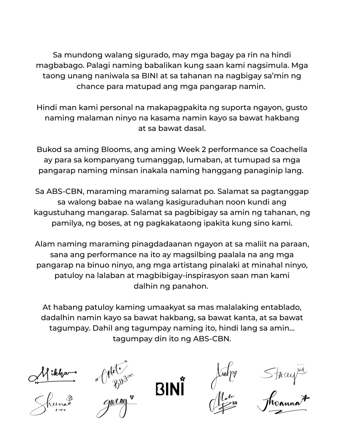 Kaya sa latest Facebook post ng BINI nitong Biyernes, Abril 17, sinabi nila na bukod sa Blooms, alay nila sa ABS-CBN ang kanilang Week 2 performance sa Coachella.